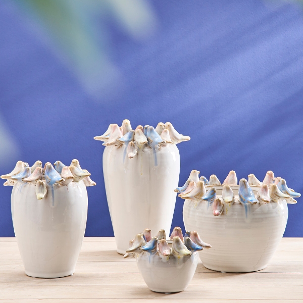 Vase en faience de couleur beige avec une ribambelles d'oiseaux sur le pourtour aux teintes pastelles.