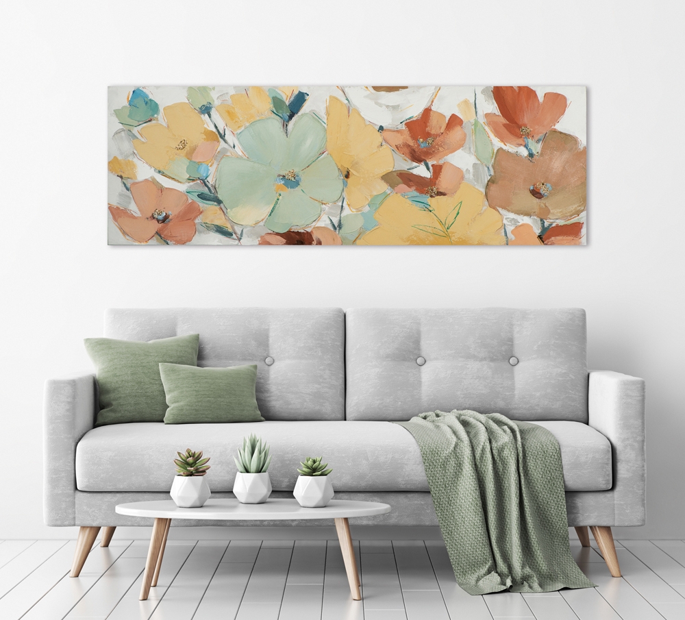 Peinture acrylique repésentant de grosses fleurs aux teintes pastels.